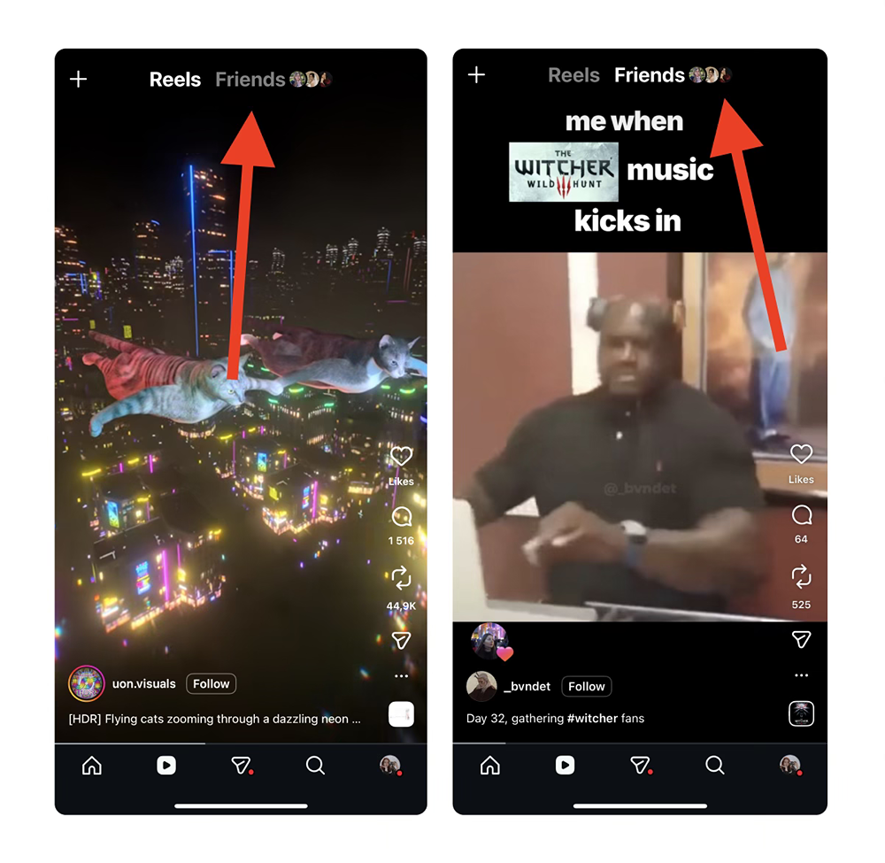 Friends’ Reels sits next to the main Reels feed on Instagram. Instead of showing content recommended by the platform, it displays Reels that were liked or commented on by people you follow. This is somewhat similar to the main Instagram feed that is now split into the Following, Favorites, and algorithmically driven feed.