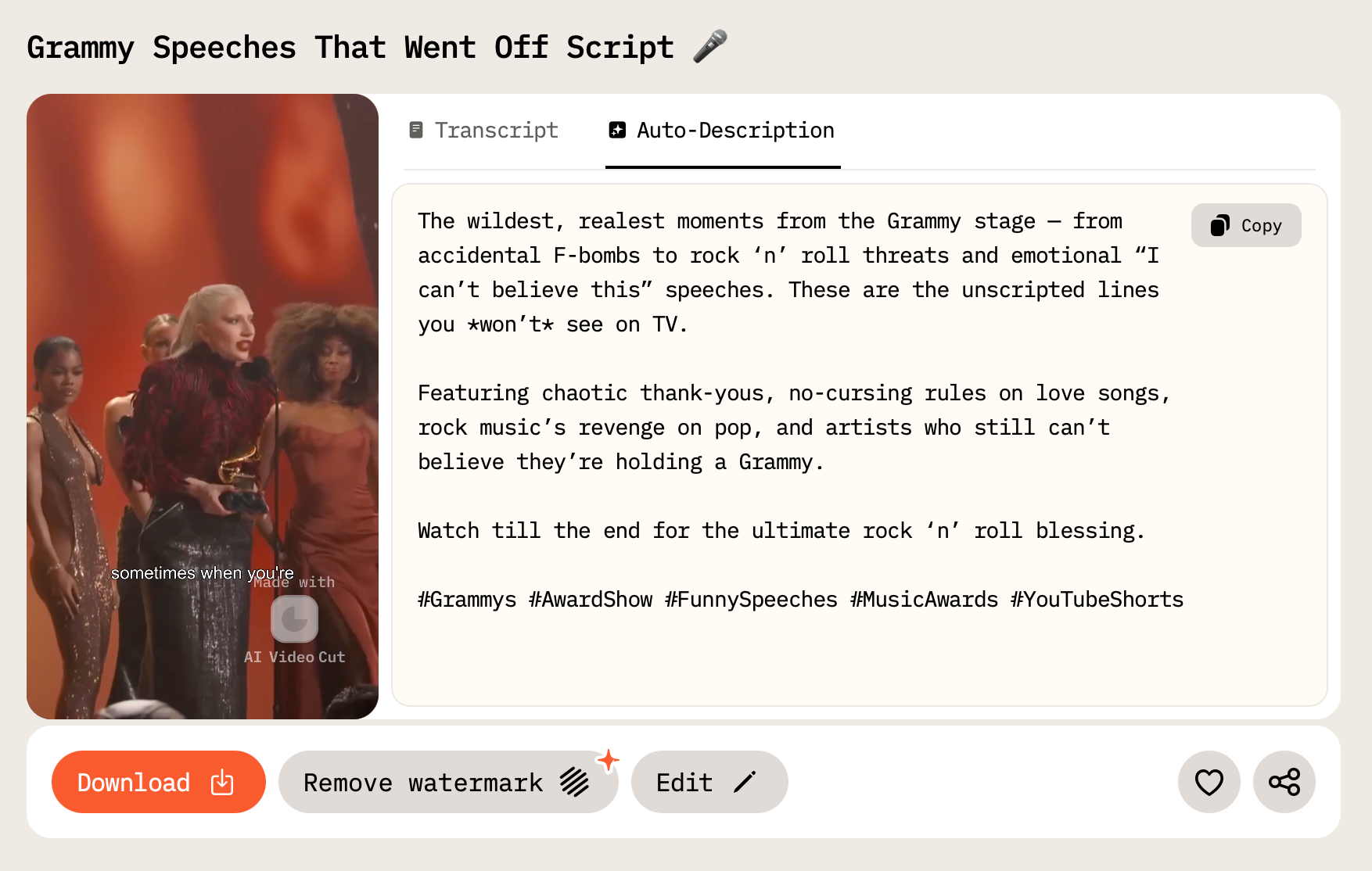 In addition to the video, AI Video Cut automatically generates a caption and hashtags that you can copy and paste right on TikTok when publishing.