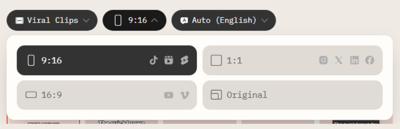 - Choose the output, aspect ratio, and clip length. The tool scans the audio and transcript to detect key moments, strong quotes, emotional peaks, and topic shifts.